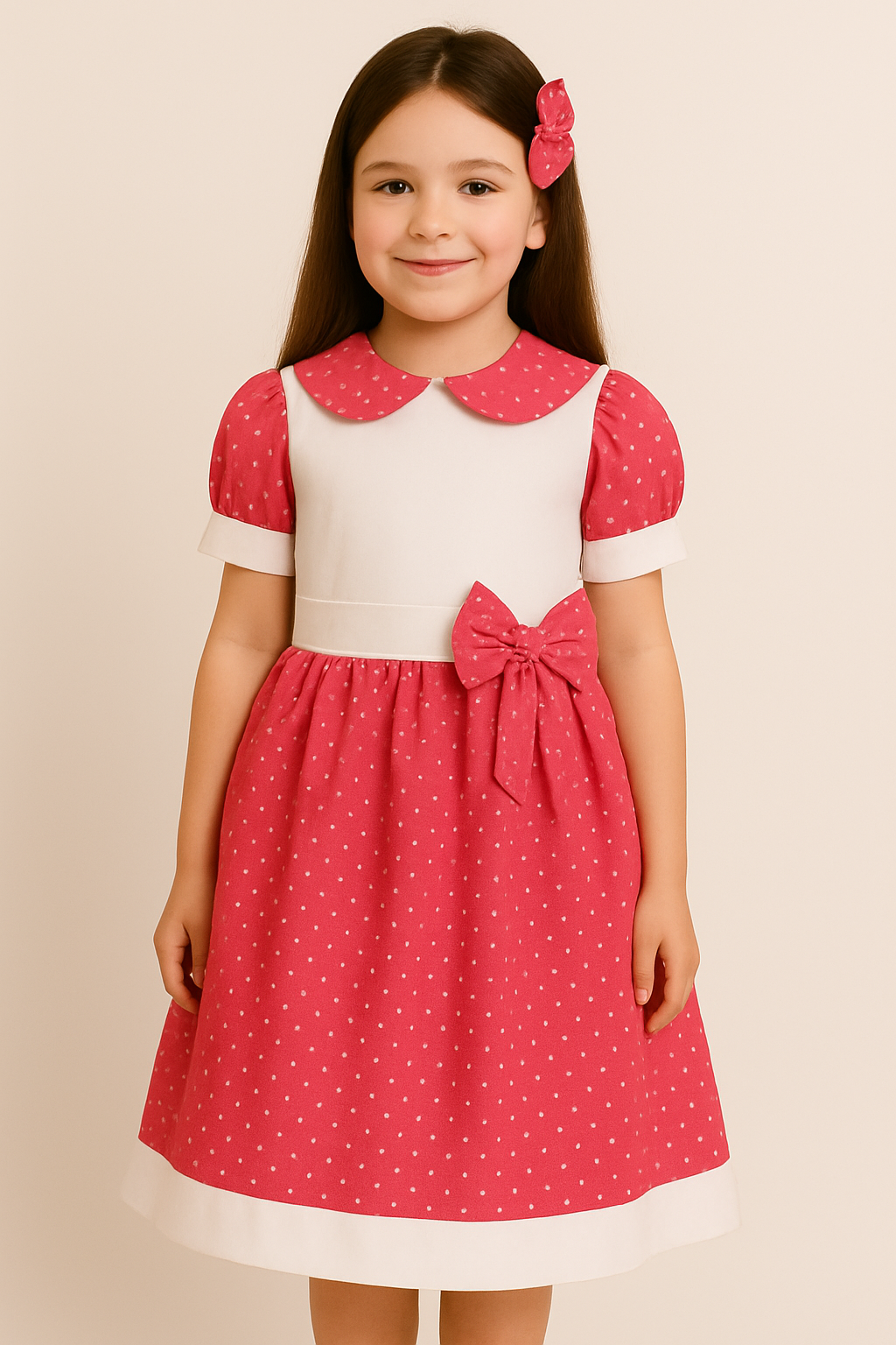 Kız Çocuk Fuşya Puantiye Detaylı Elbise & Toka & Aksesuar Takımı