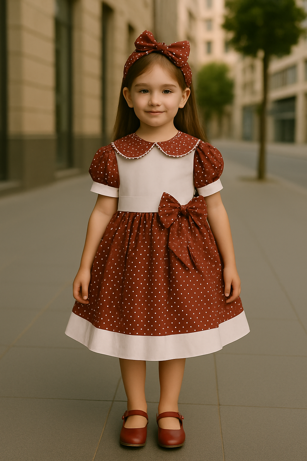 Kiremit rengindeki puantiye detaylı tasarımıyla dikkat çeken kız çocuk elbisesi, hem şık hem de eğlenceli bir stil sunar.; Kısa kollu yapısı ve fermeruarlı kapama şekli sayesinde kolayca giyilip çıkarılabilir..Düğün veya nikah gibi özel ortamlarda da göz alıcı bir görünüm kazandırır.; İç göstermeyen astarı sayesinde çocuğunuzun rahat hareket etmesini sağlarken aynı zamanda şıklığını korur.; Kız çocuk takımının tamamlayıcısı olarak sunulan toka aksesuarı da stilini tamamlamak isteyenler için idealdir.;