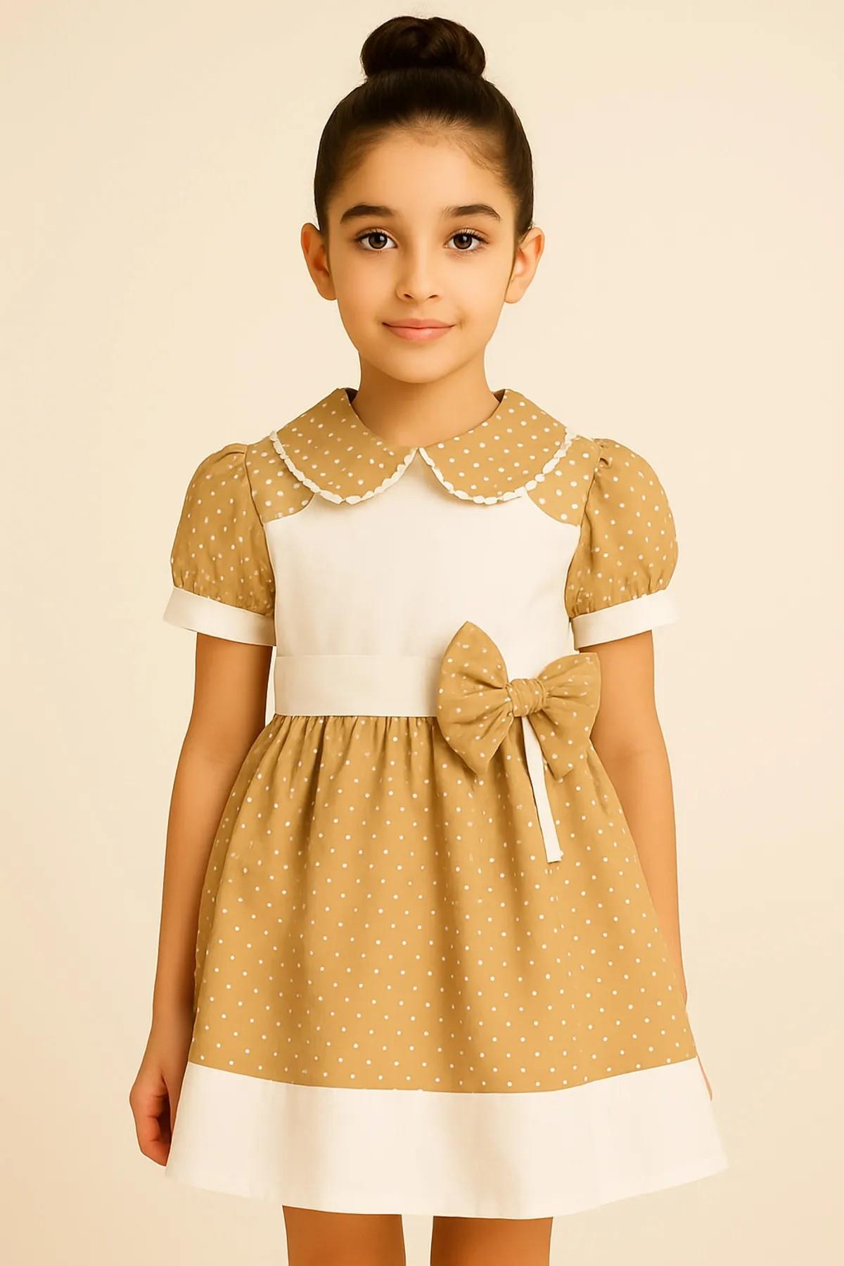 Kız Çocuk Sütlü Kahve Puantiye Detaylı Elbise & Toka & Aksesuar Takımı
